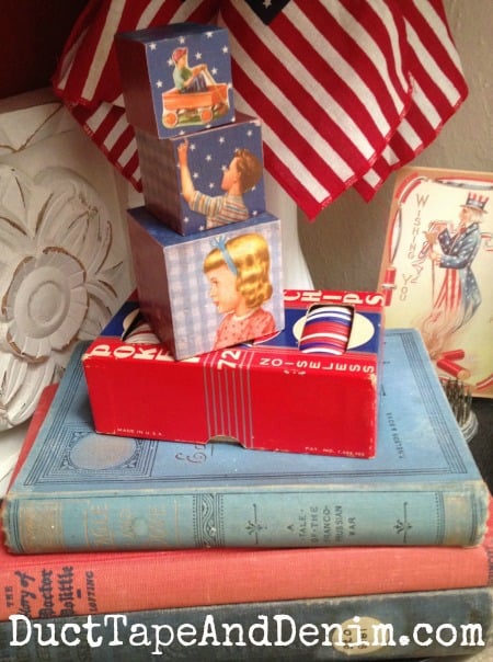 Learn how to make patriotic decorations out of wooden blocks with vintage illustrations.