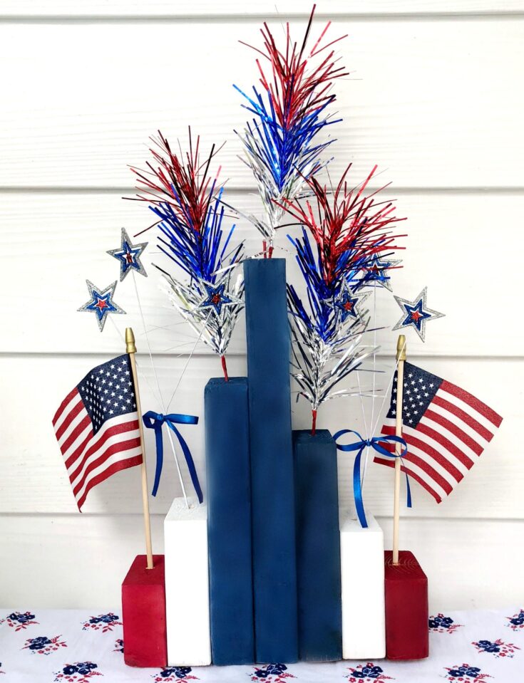 Create a simple patriotic centerpiece using leftover scrap wood, paint, and a touch of creativity. Just cut the wood to size, paint in red, white, and blue, and arrange in a festive display perfect for summer celebrations.
