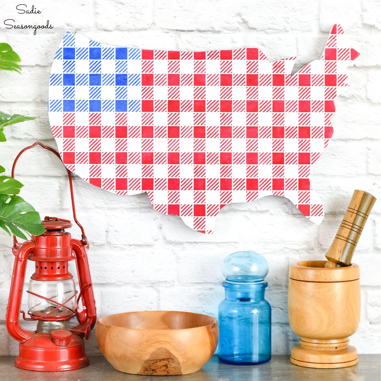 Transform a wooden USA-shaped clock into festive American flag decor using a buffalo plaid stencil for a unique twist on classic patriotic style. Just add red, white, and blue paint to the stencil for a rustic look that’s perfect for summer celebrations.