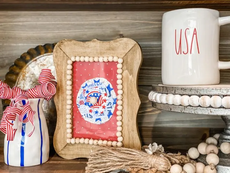 Create a charming DIY patriotic wood frame to showcase your American pride with red, white, and blue accents—perfect for a coffee bar or summer celebrations.