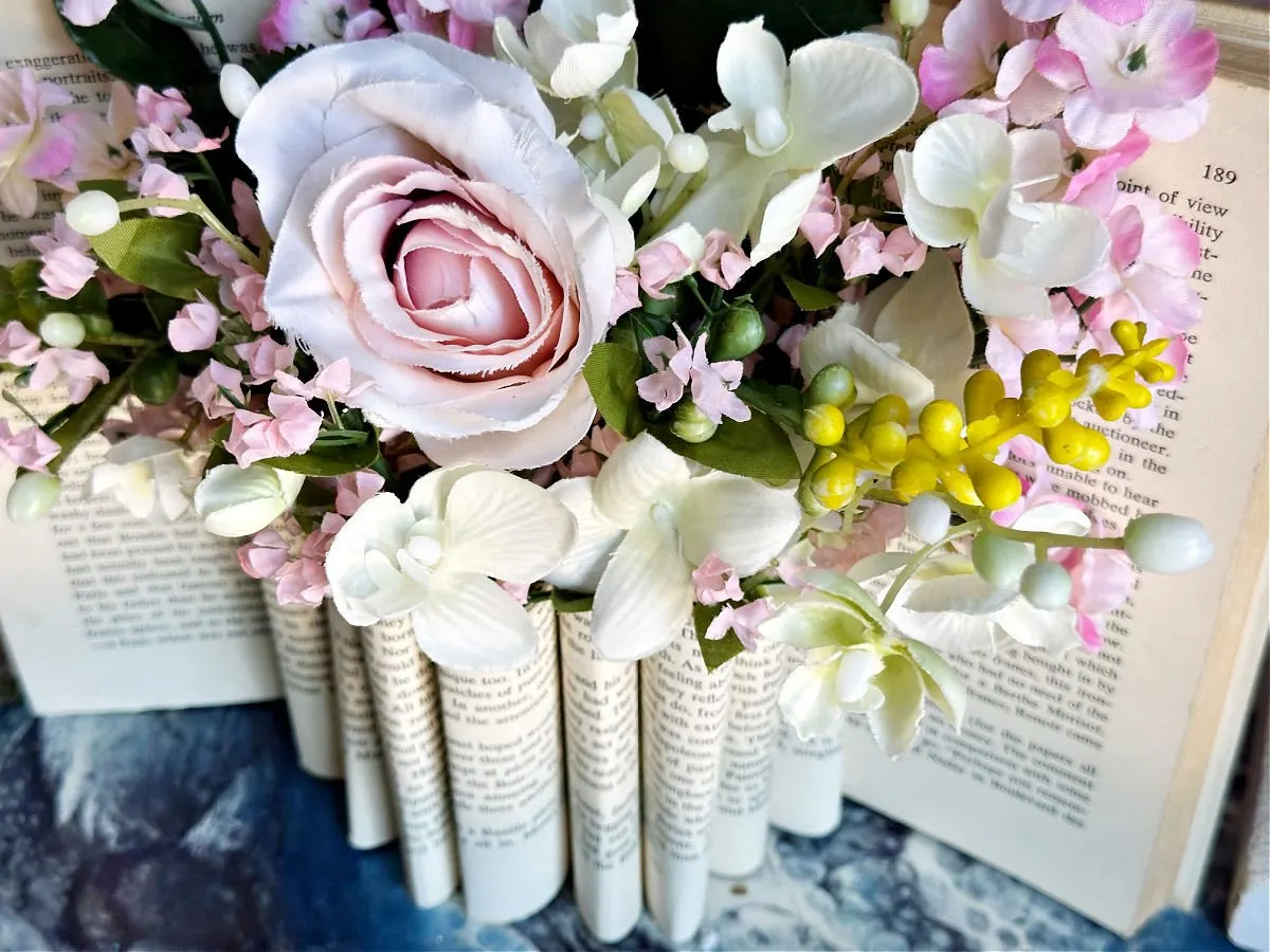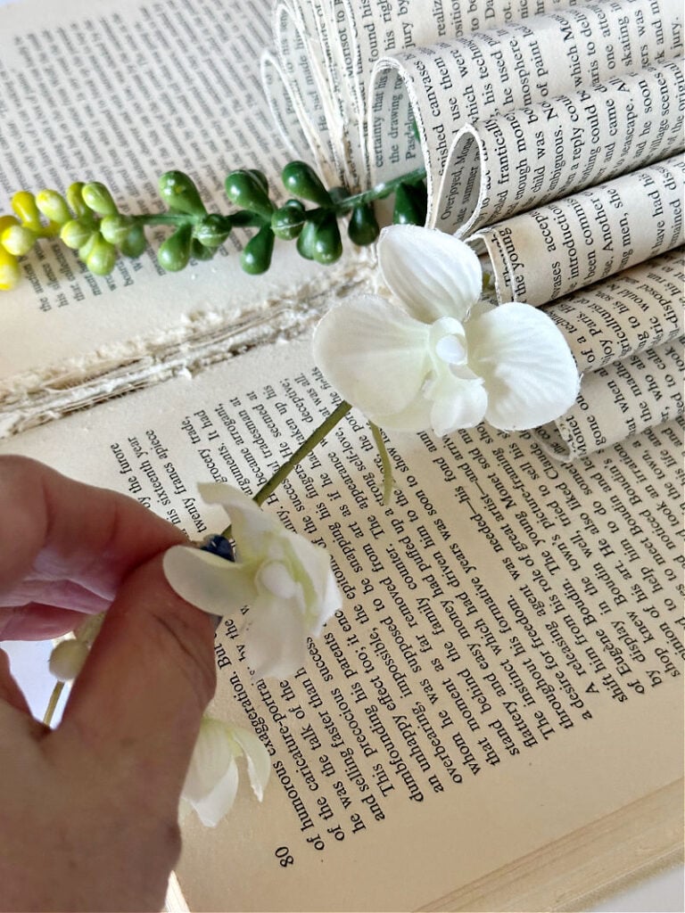 - Add your faux flowers by placing tall flowers first to cover up the center of the book spine.