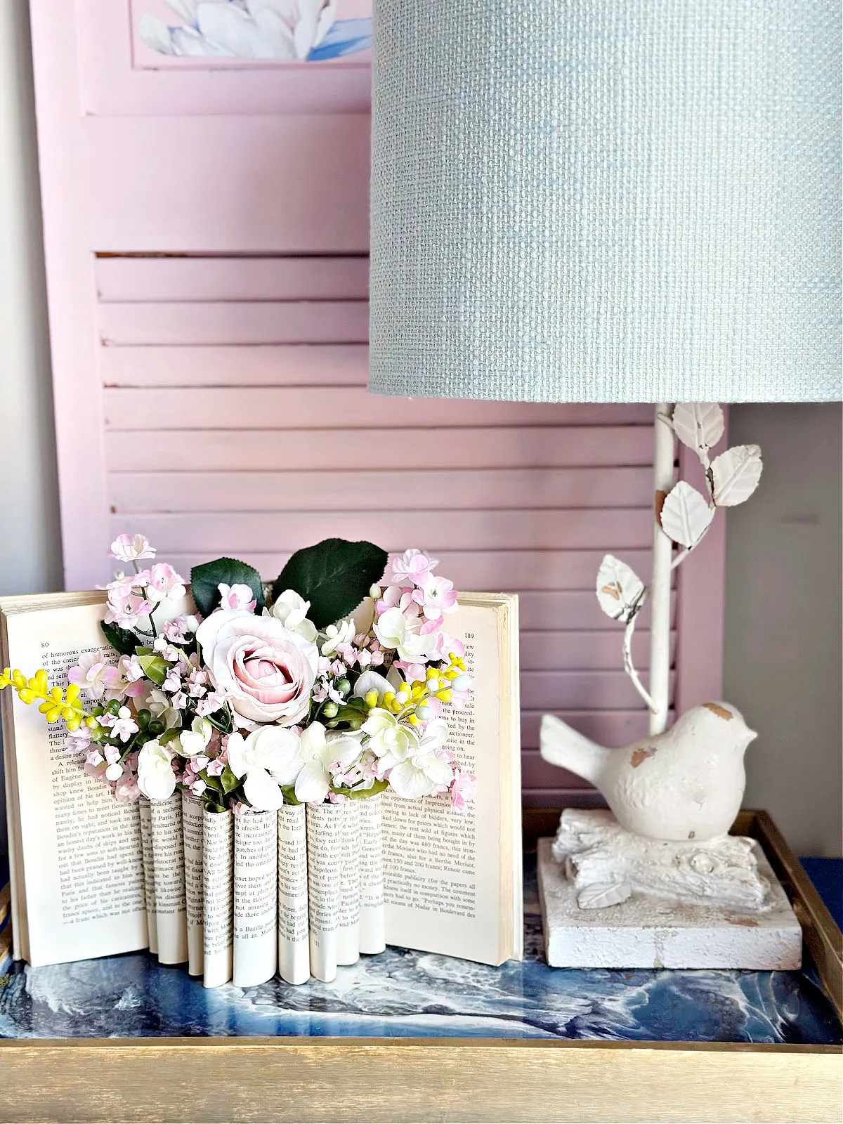 If you want to take your DIY book vase to the next level, decoupage the book cover with pretty paper and mod podge.