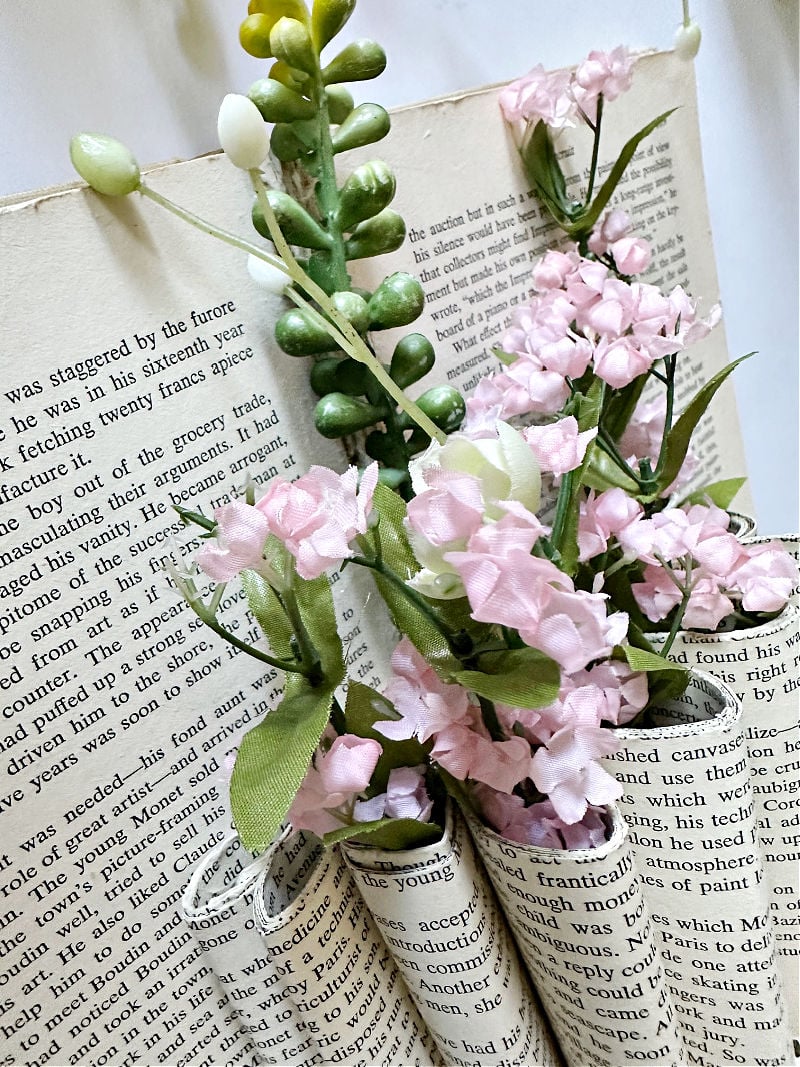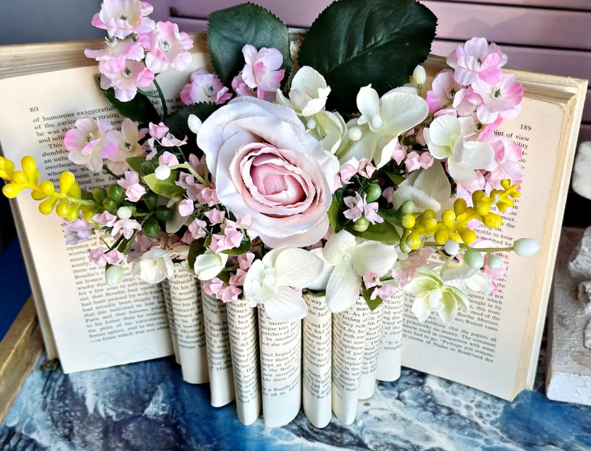Start with tall flowers first to cover up the center of the book spine. Simply place them into the rolled pages of your vase. Trim the length of each flowers as needed.