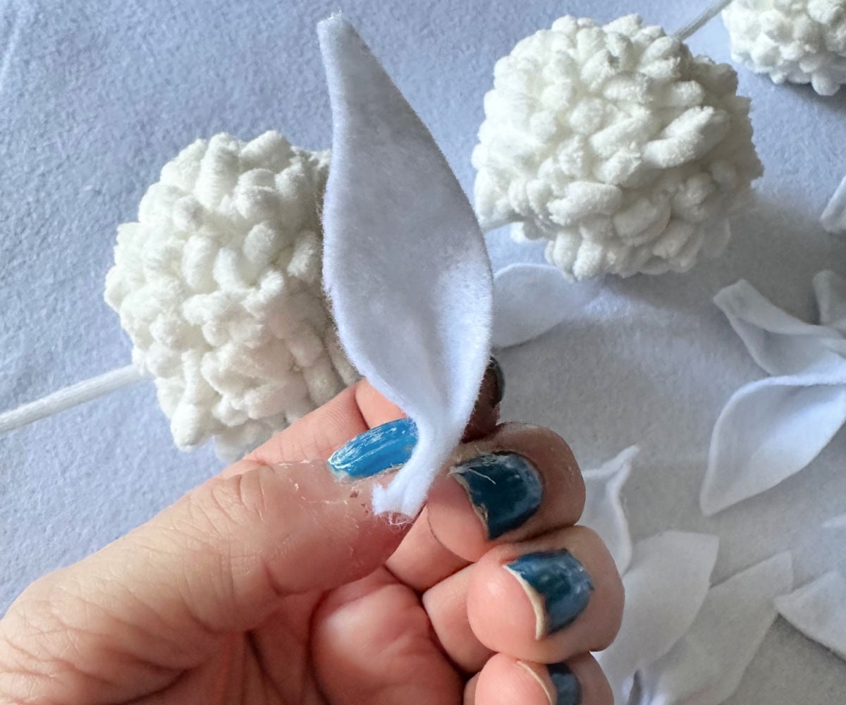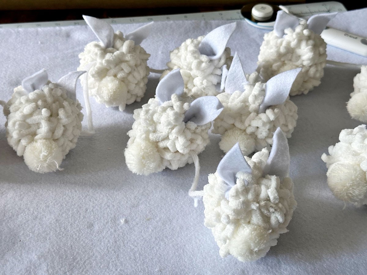 I used 12 white pom poms for this bunny banner. The size of the bunny ears will be determined by the size of your pom poms.