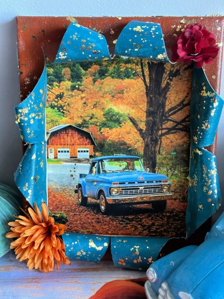 Next up, decorate the canvas board with your fall truck printable. This will be what shows through the opening so you want it to pop.
