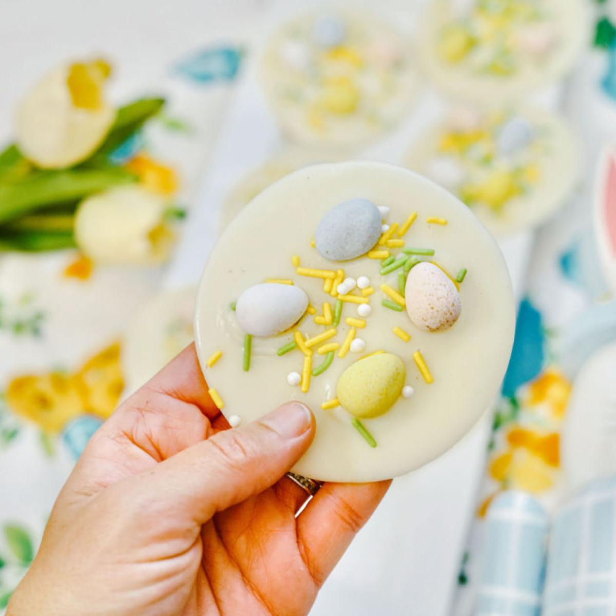 Quickly cover the melted chocolate with mini Cadbury eggs & sprinkles.