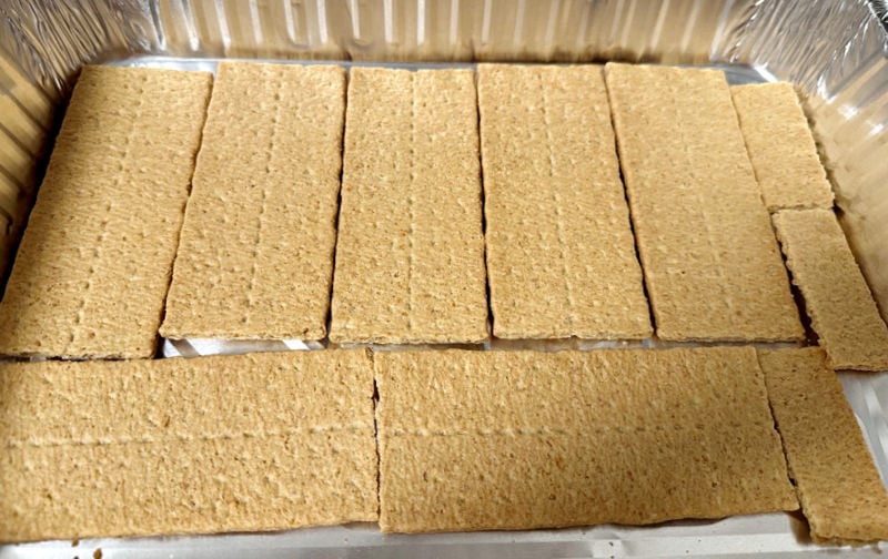 - Lightly coat a 9x13-inch glass dish with nonstick spray. Line the bottom with whole graham crackers, breaking a few if needed to fully cover the surface.