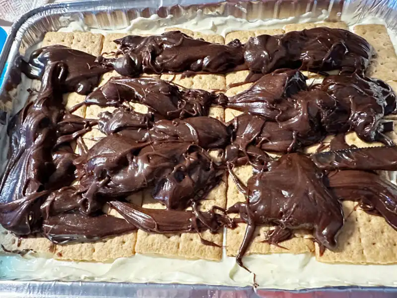 Step Four: Spread half of the pudding mixture over the graham cracker layer. Add another layer of crackers on top, then spread the remaining pudding mixture.