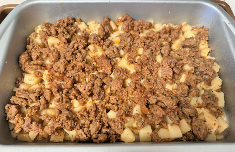 - Spread the cooked chorizo mixture into the baking dish, spreading it out evenly over the potatoes.