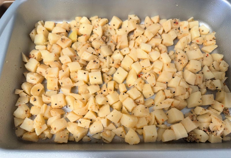 Add Potatoes: Pour the bag of frozen diced potatoes in the bottom of the greased 9 x 13 cooking pan. Season with salt, pepper and paprika.