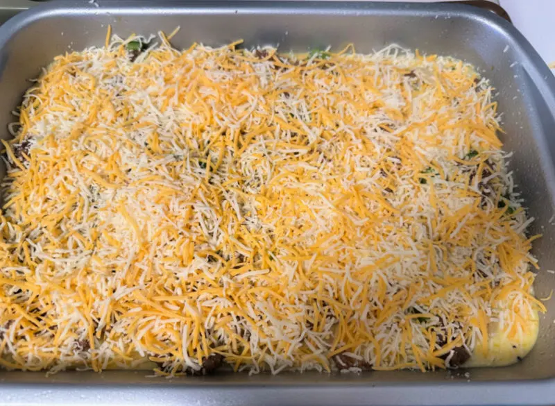 Cover with cheese: cover the entire dish with shredded cheese. I used a Mexican 4 cheese blend. You can use your favorite. A Pepper Jack would be great!