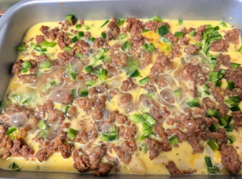 Add Eggs: Pour the egg and milk mixture over the dish and mix it up so everything is covered.