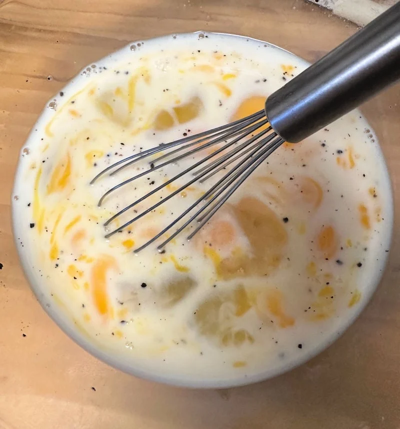 - Place the eggs in a large bowl and whisk with 1 cup of milk.