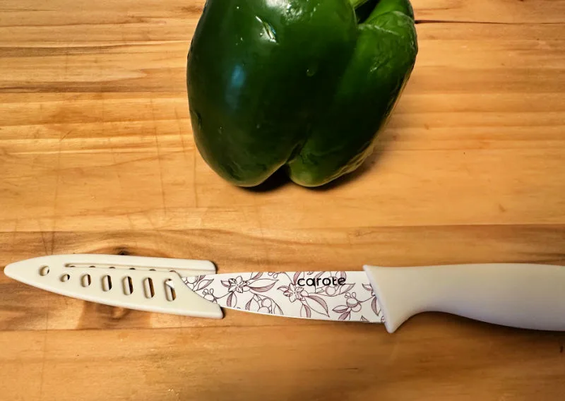 - Sharp Knife – to dice peppers and onions I’m in love with the Carote knife set to go with my pans. They have a pretty design and are under $18!