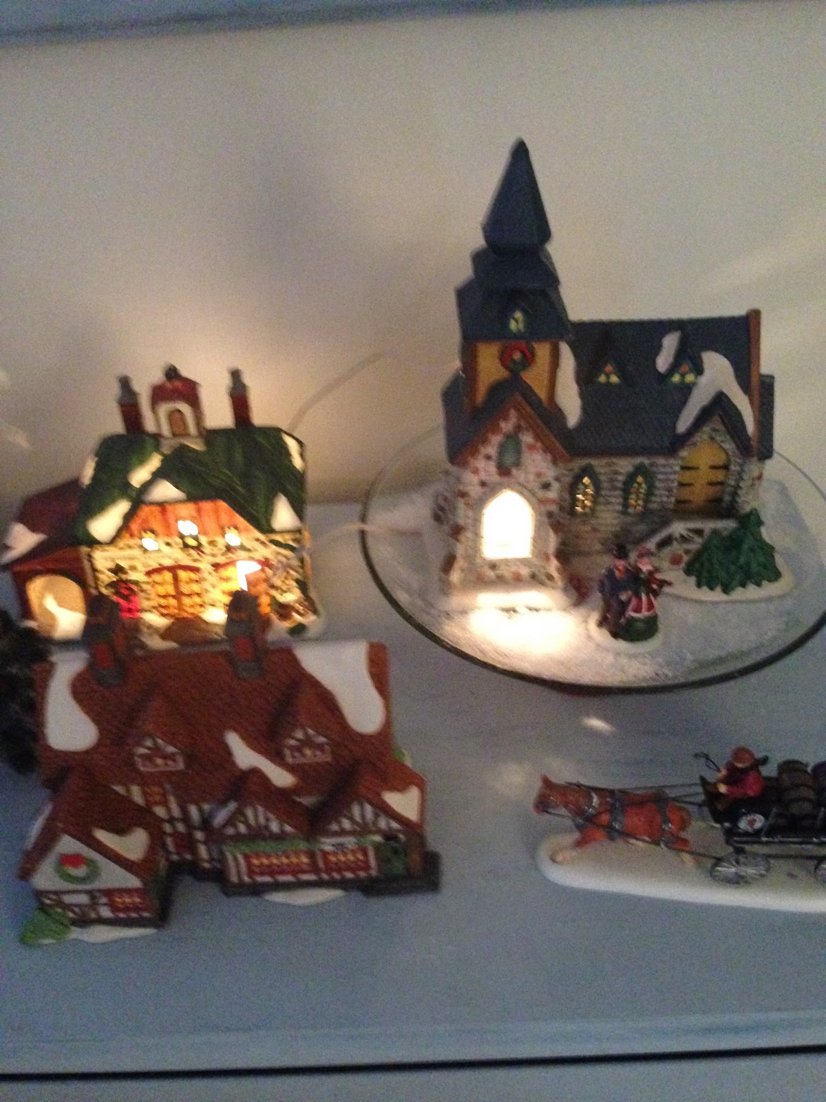 I decided not to put out all my Dept 56 houses this year as I was a little behind decorating & it is so much to set them all up just to take them down, so I just displayed a few in a vignette in the living room. I love using the cake stand as a way to add height.