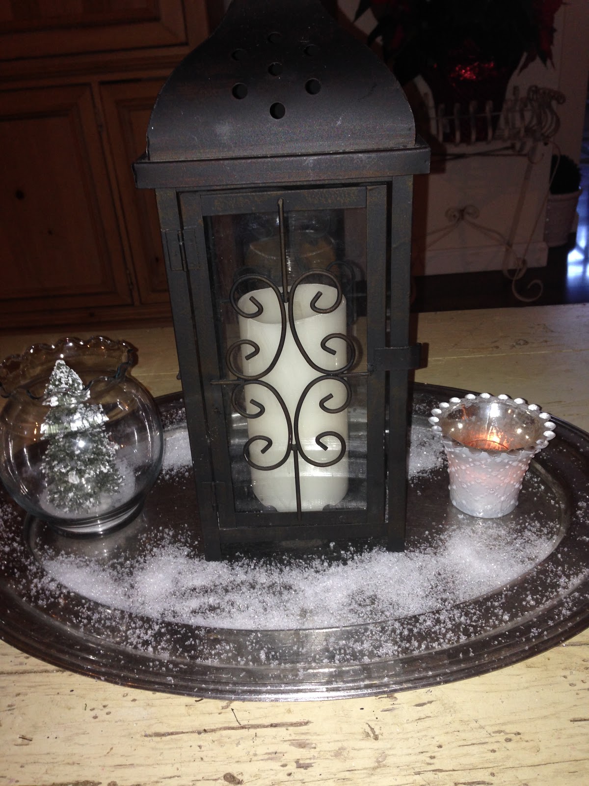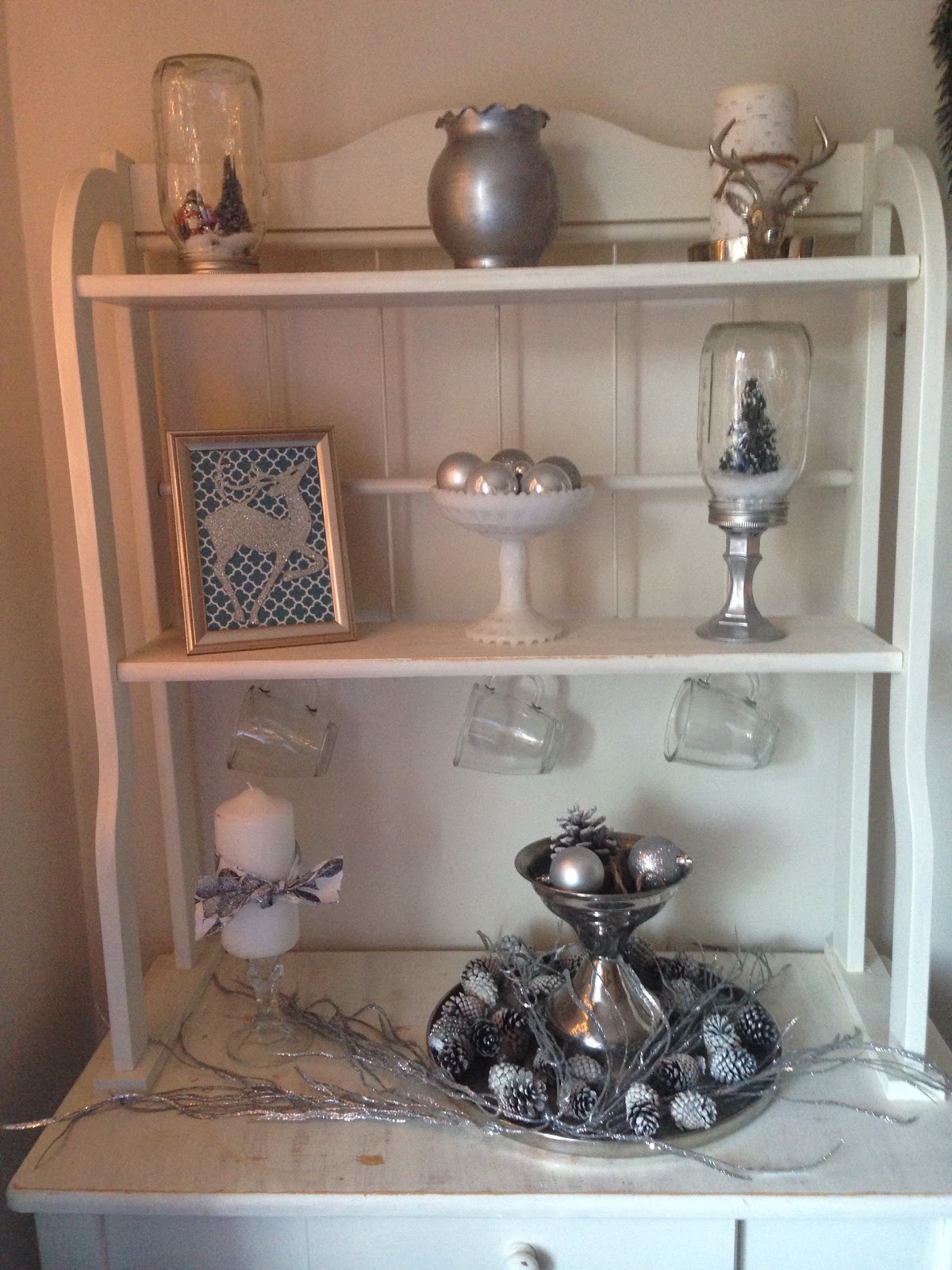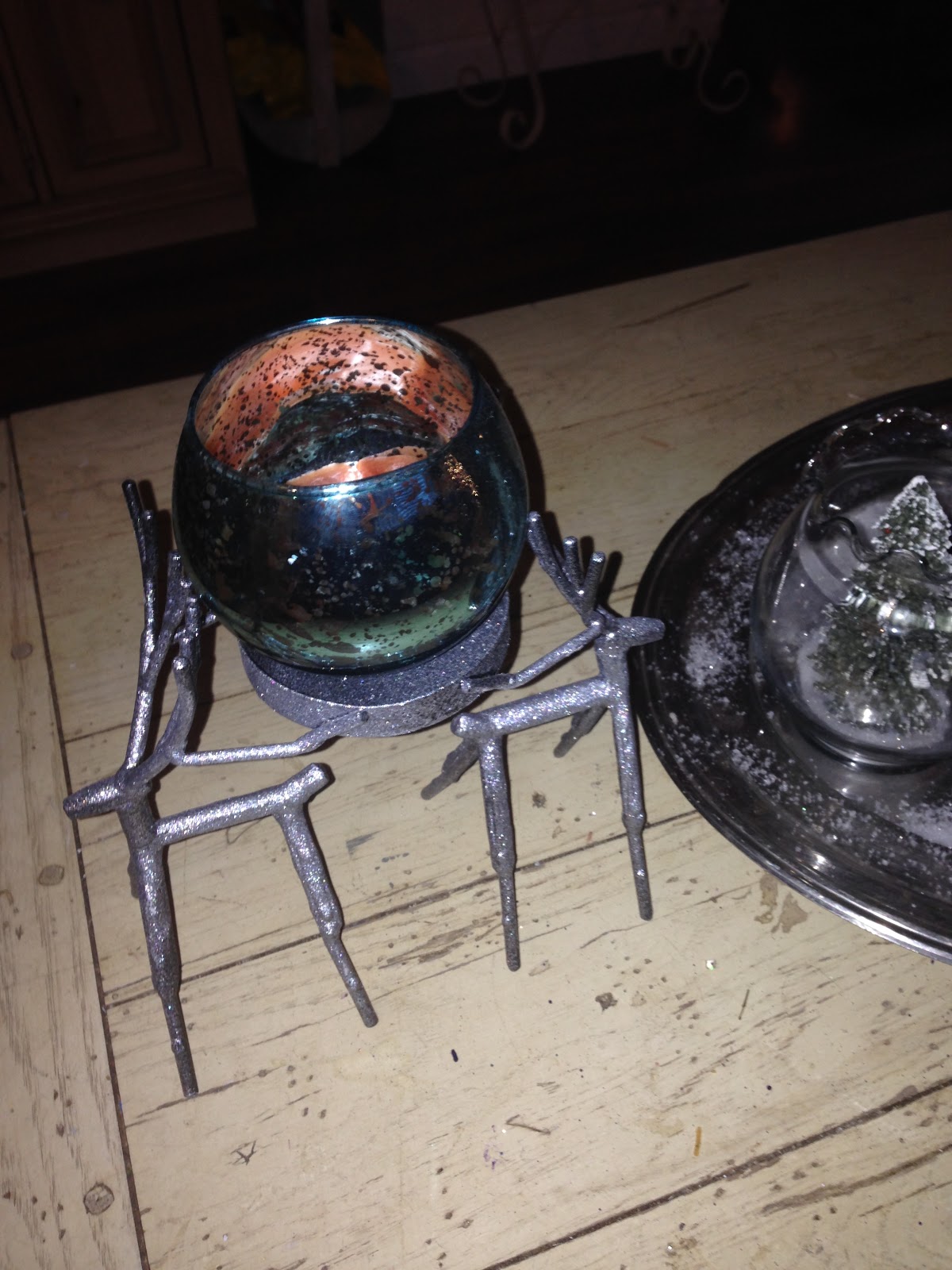 I didn’t want to obstruct our view so I left the coffee table simple with a beautiful lantern & glass jar with a tree and snow on a silver platter. Love the look of mercury glass. I also painted these little deer candleholders that I picked up at Yankee Candle on clearance last year. They were black & of course I wanted silver!