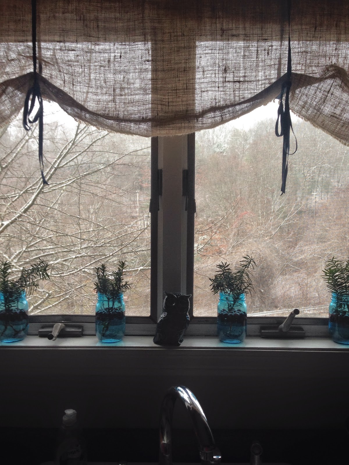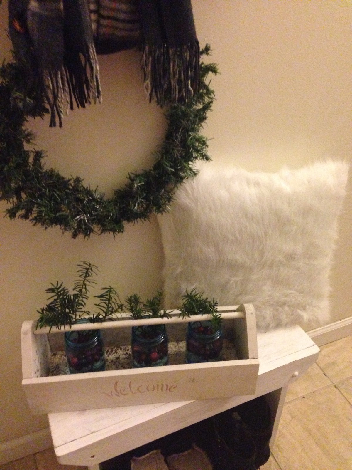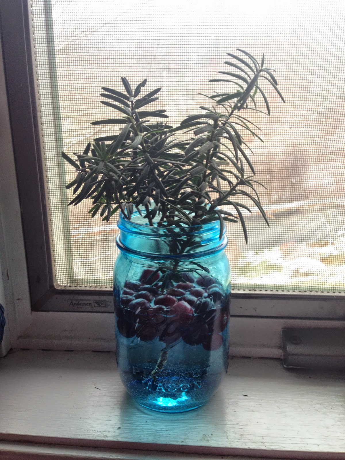 I changed out the sunflowers in the blue mason jars with floating cranberries & fresh greens.
