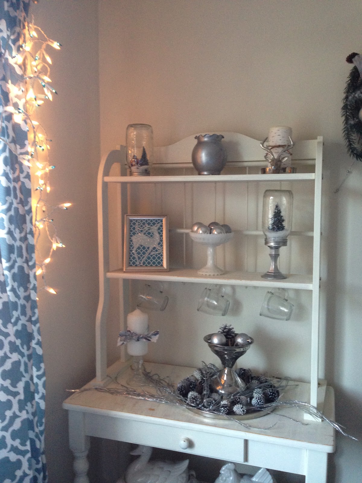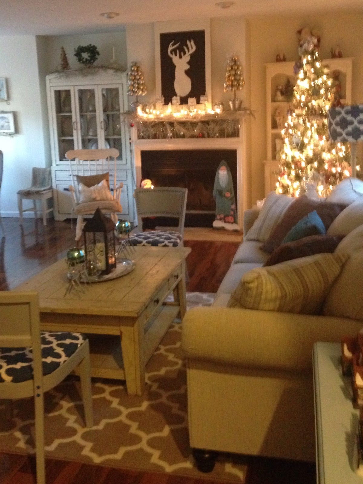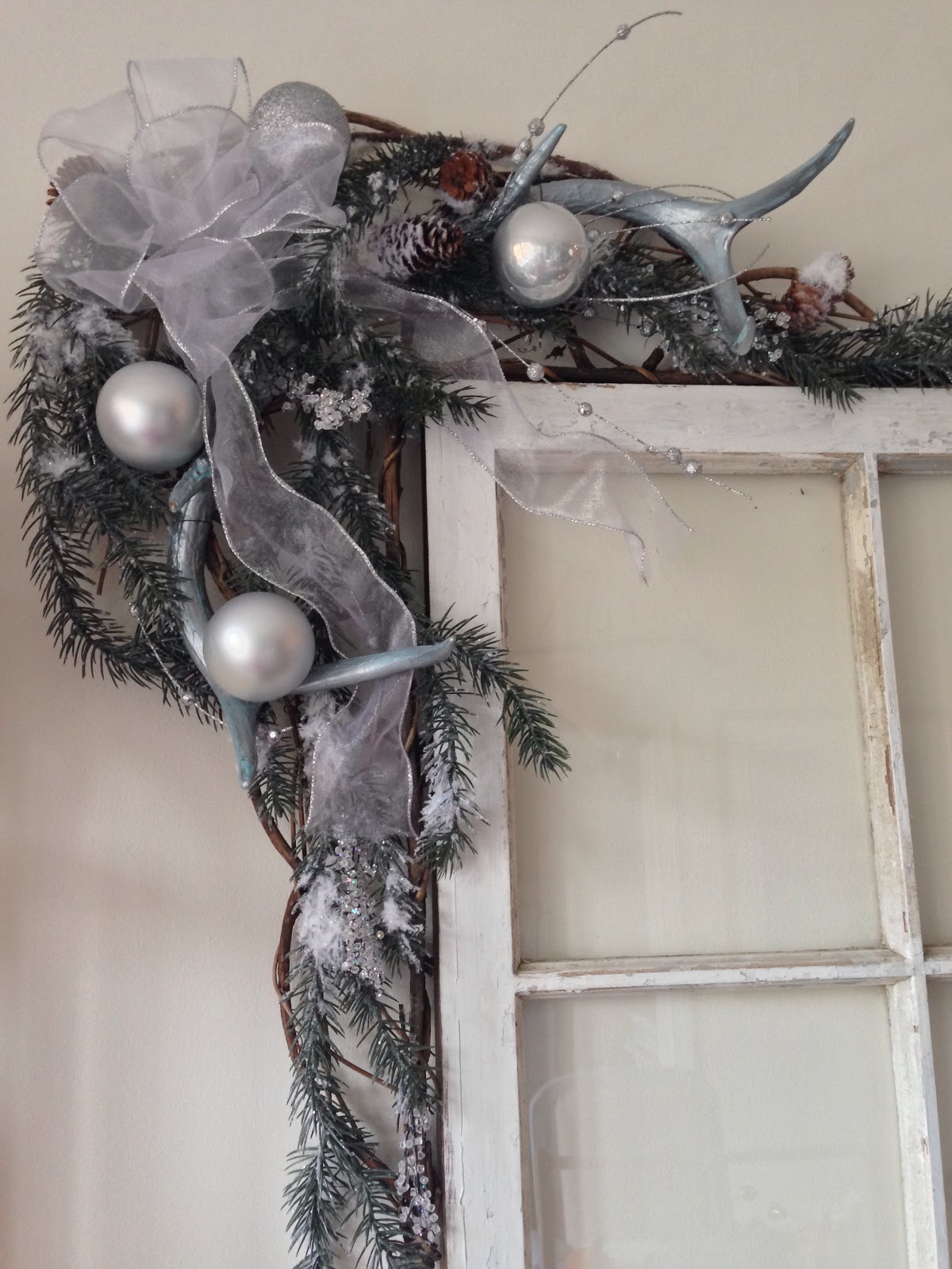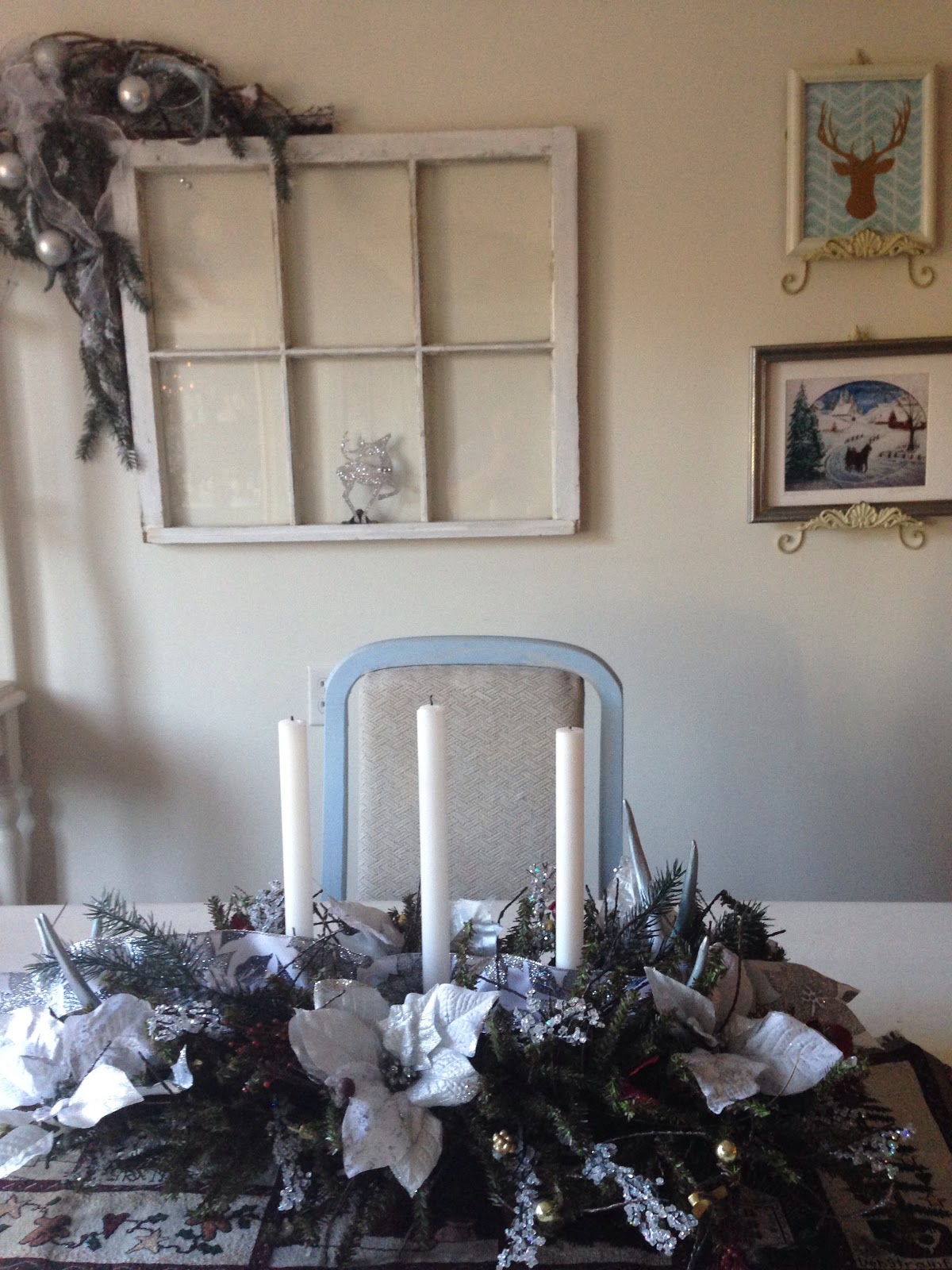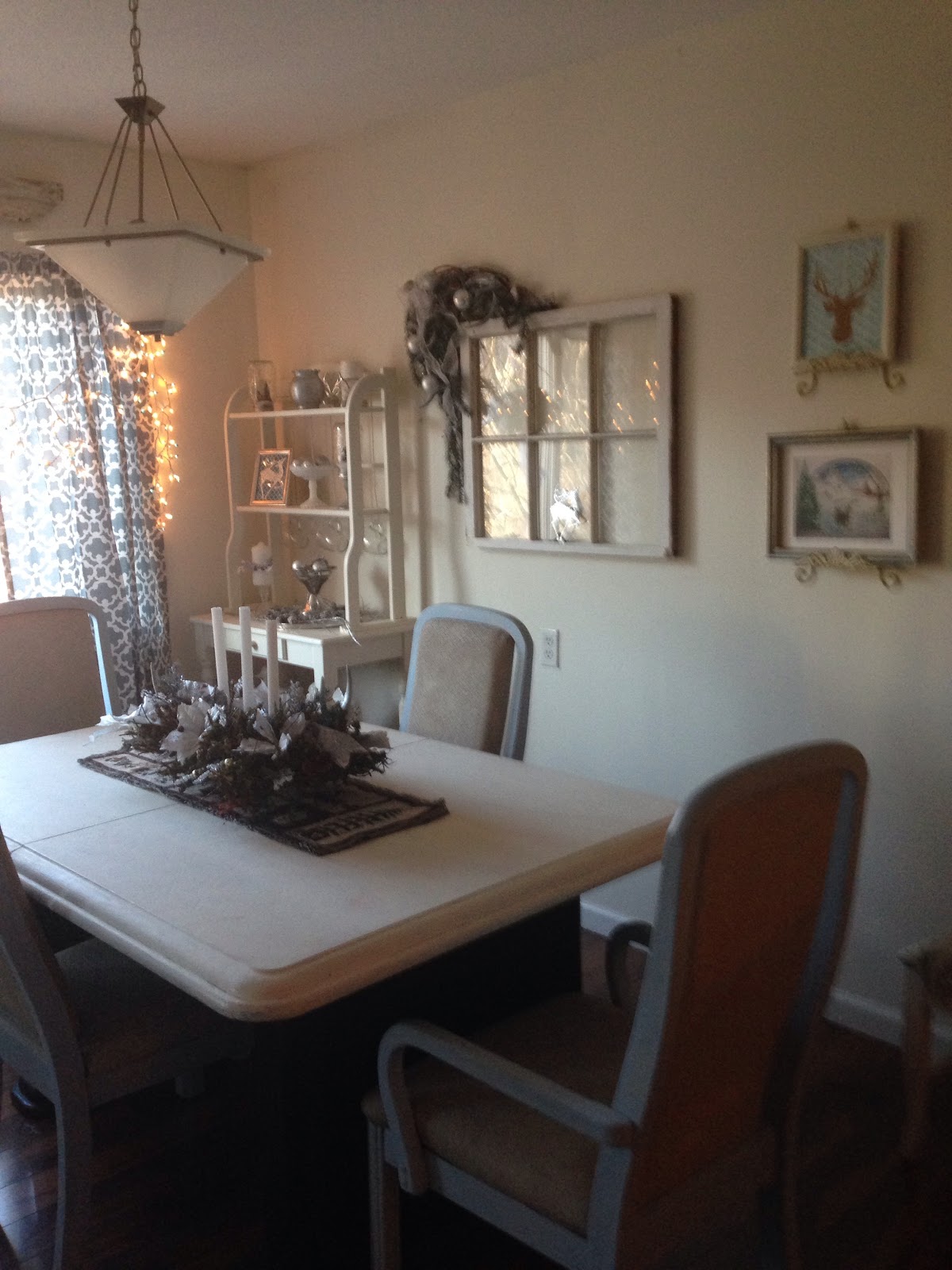 Moving on to the dining room I stuck with the same color scheme as it is open to the living room. One of my favorite pieces is the DIY swag with deer sheds that I painted silver. It fits perfectly over the old window my Dad gave me. I guess you can tell I kind of have a thing for Deer!