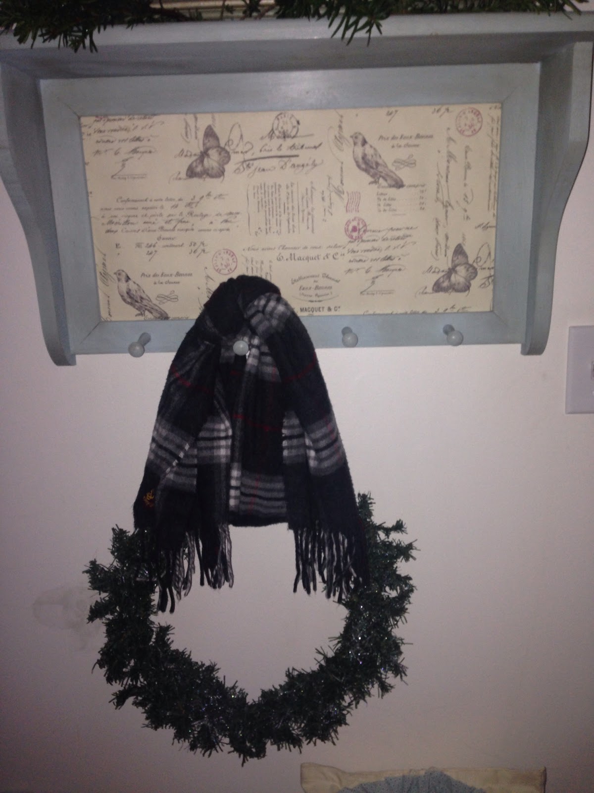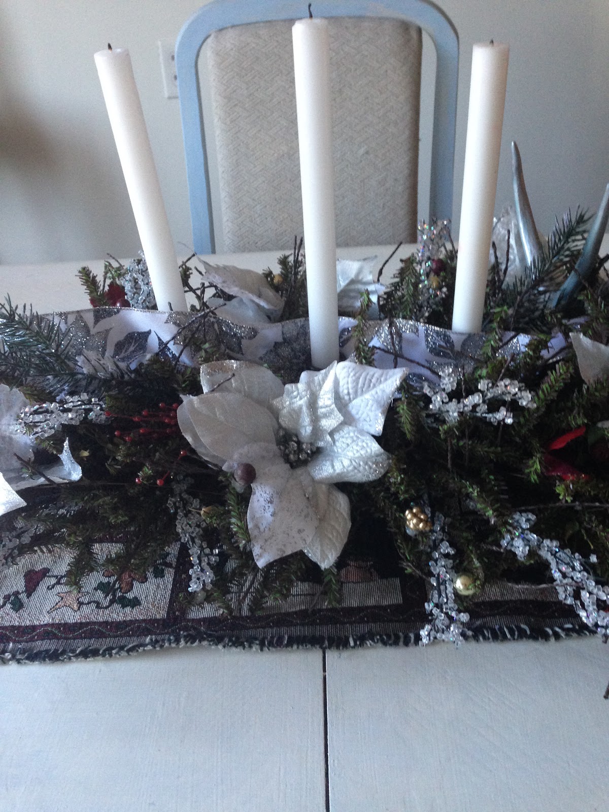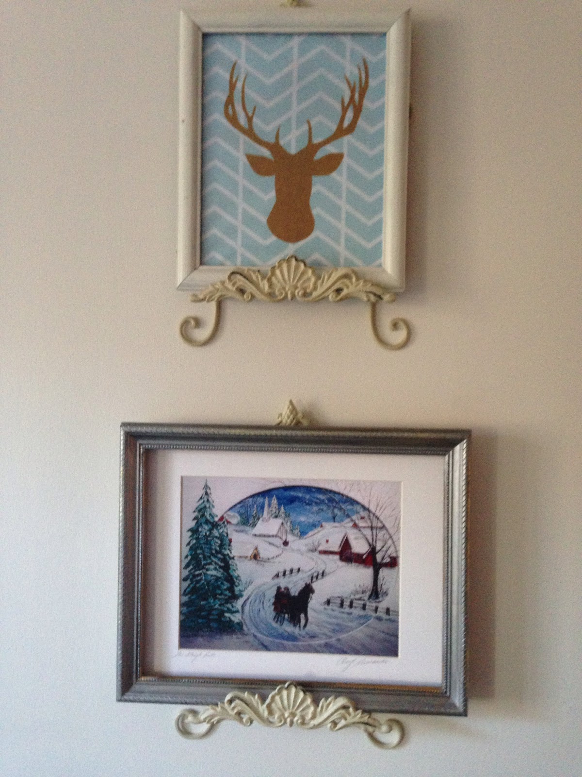 Another simple vignette in the hallway along with a DIY chalkboard that was previously a mirror from a bureau. I made a simple tree & added real ornaments for a 3-d effect. I will leave this up and change out the designs. I like to use this as a menu board as well for all those fancy meals I make 😉