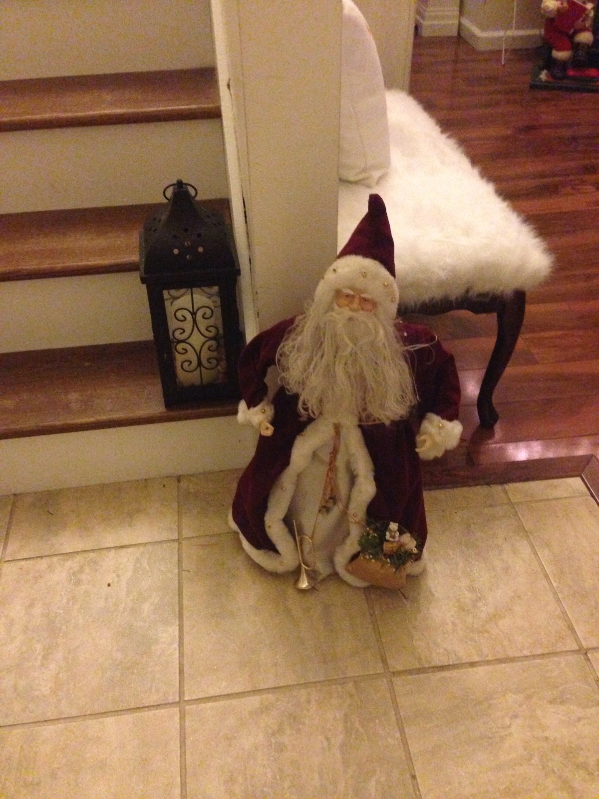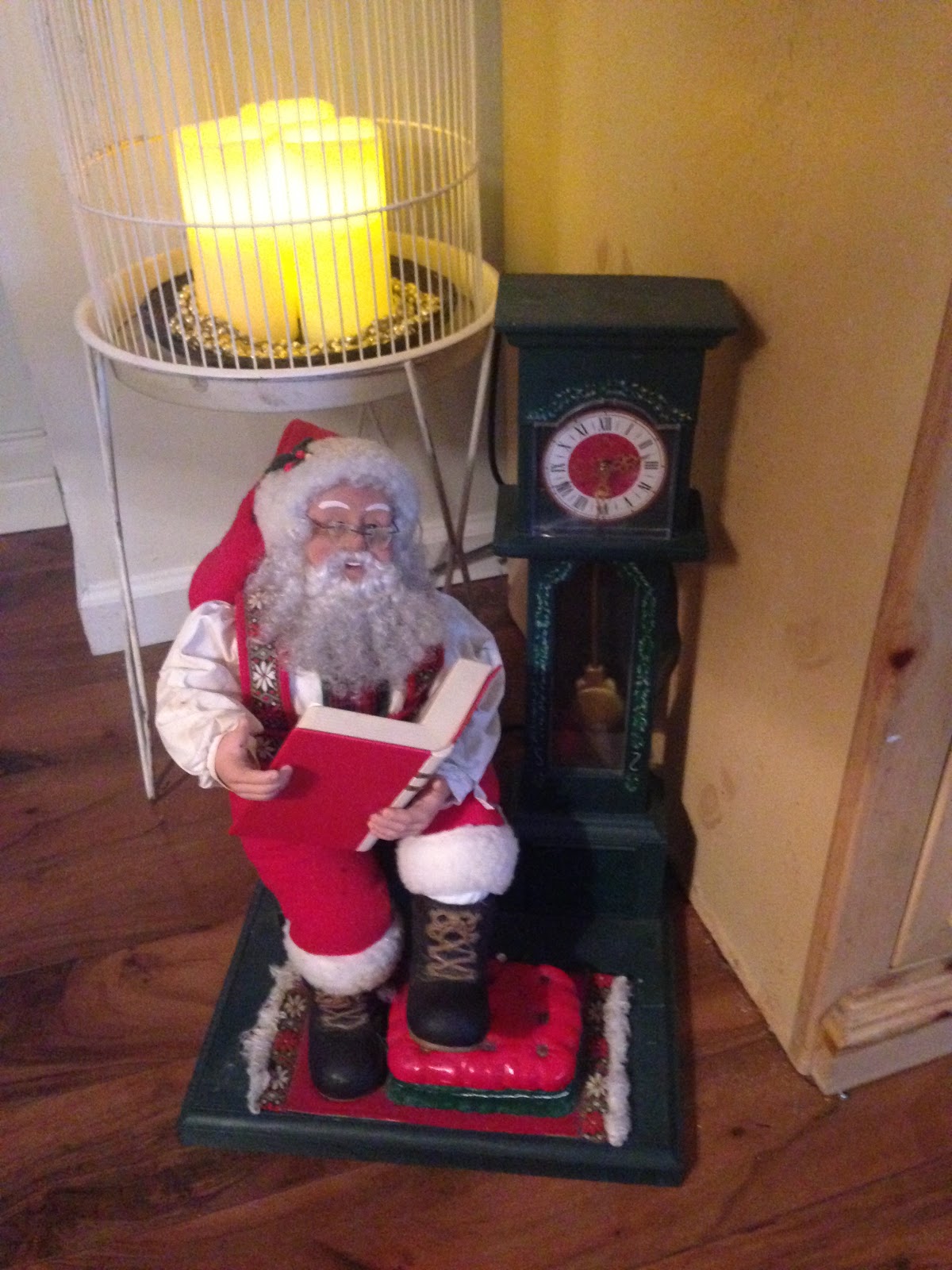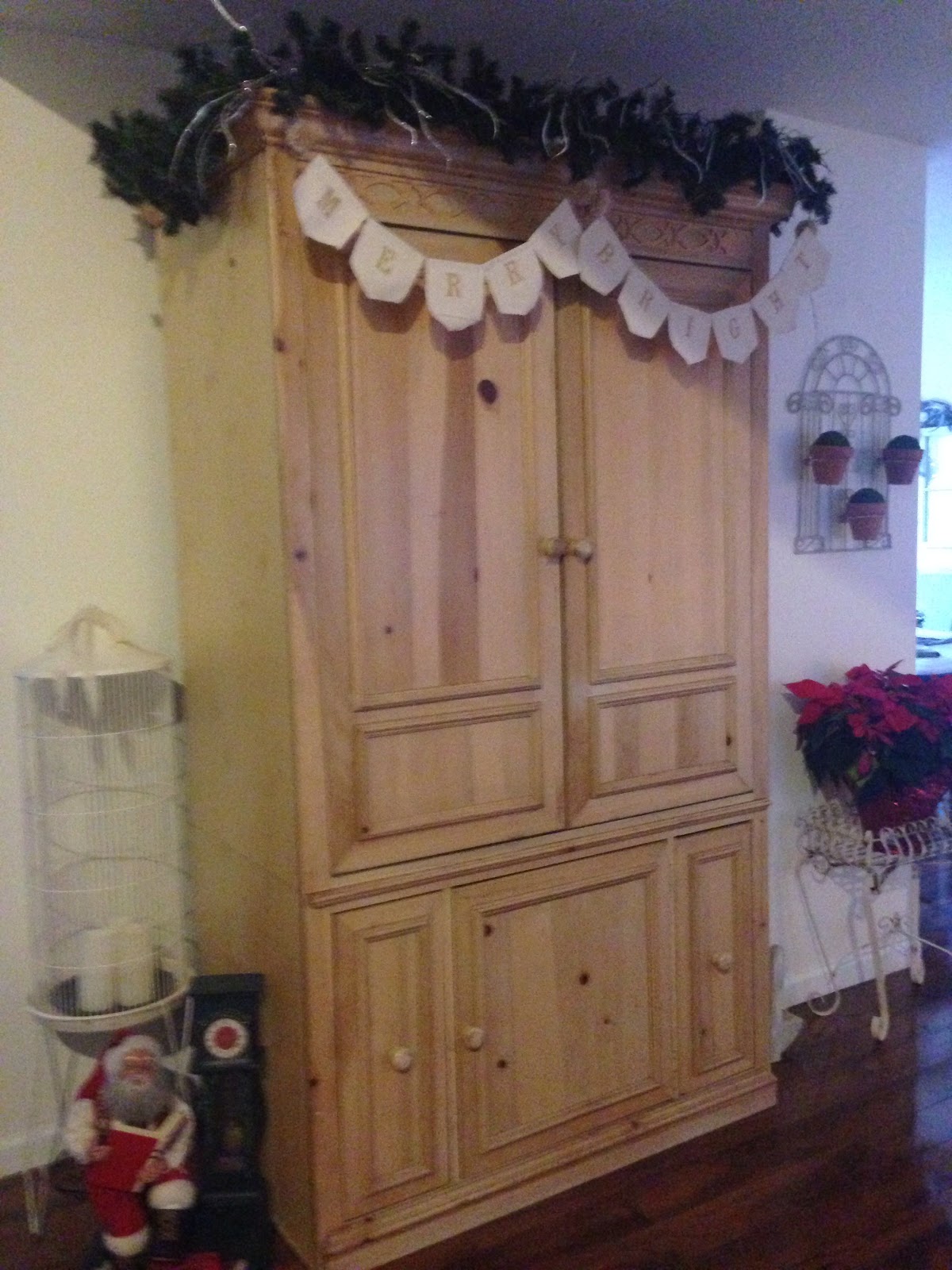 The armoire holds our television, which I love being able to hide! I added faux greens to the top with white lights & this beautiful Merry & Bright canvas banner which I received in the Elfster gift exchange this year. I collect Santa’s & have had this Santa for about 20 years. The grandfather clock works & it holds a cassette tape that plays Santa reading ‘Twas The Night Before Christmas. I have so many wonderful memories of my kids sitting around him listening to the story during the Holidays. My 18 y.o. daughter will