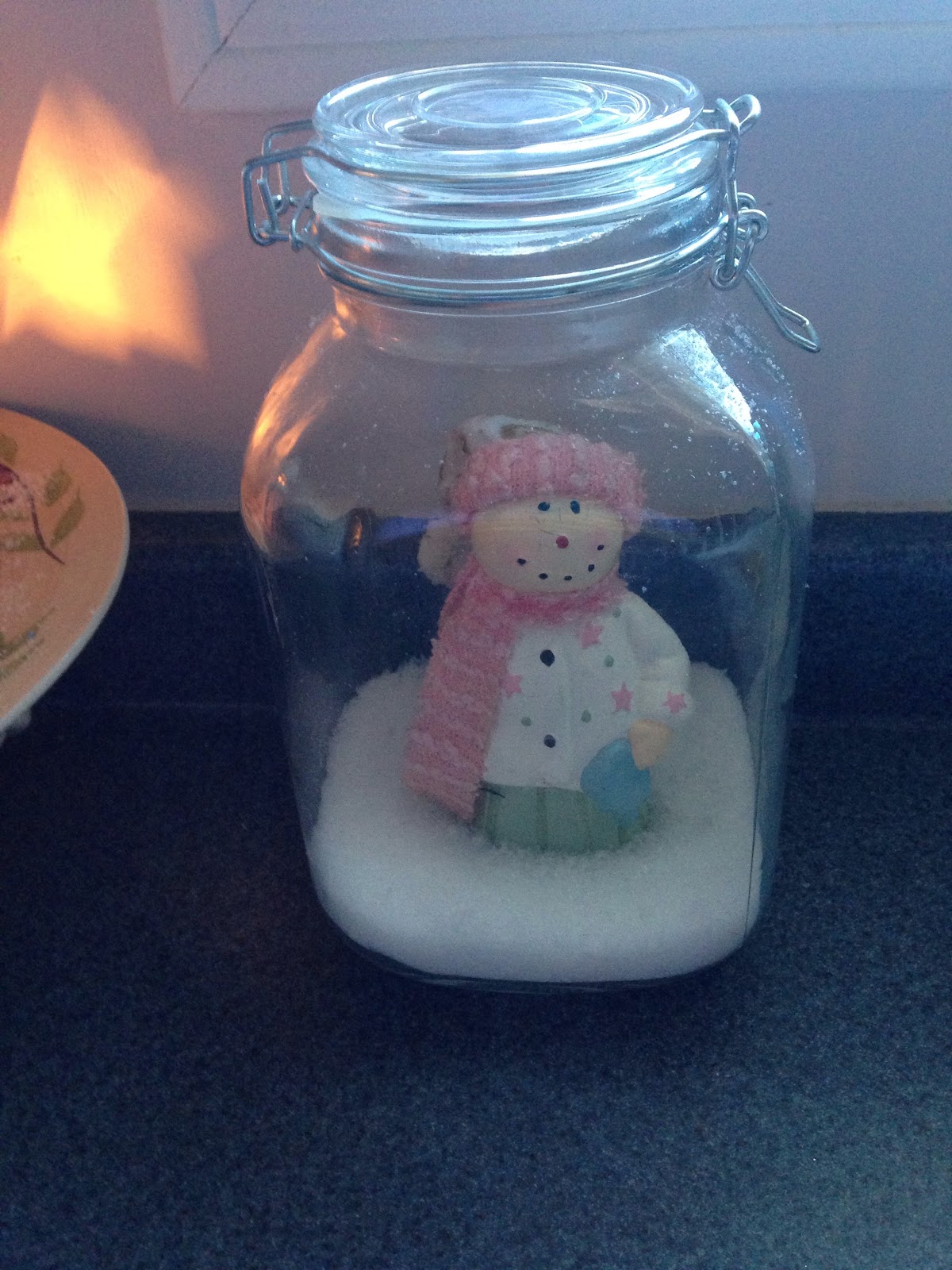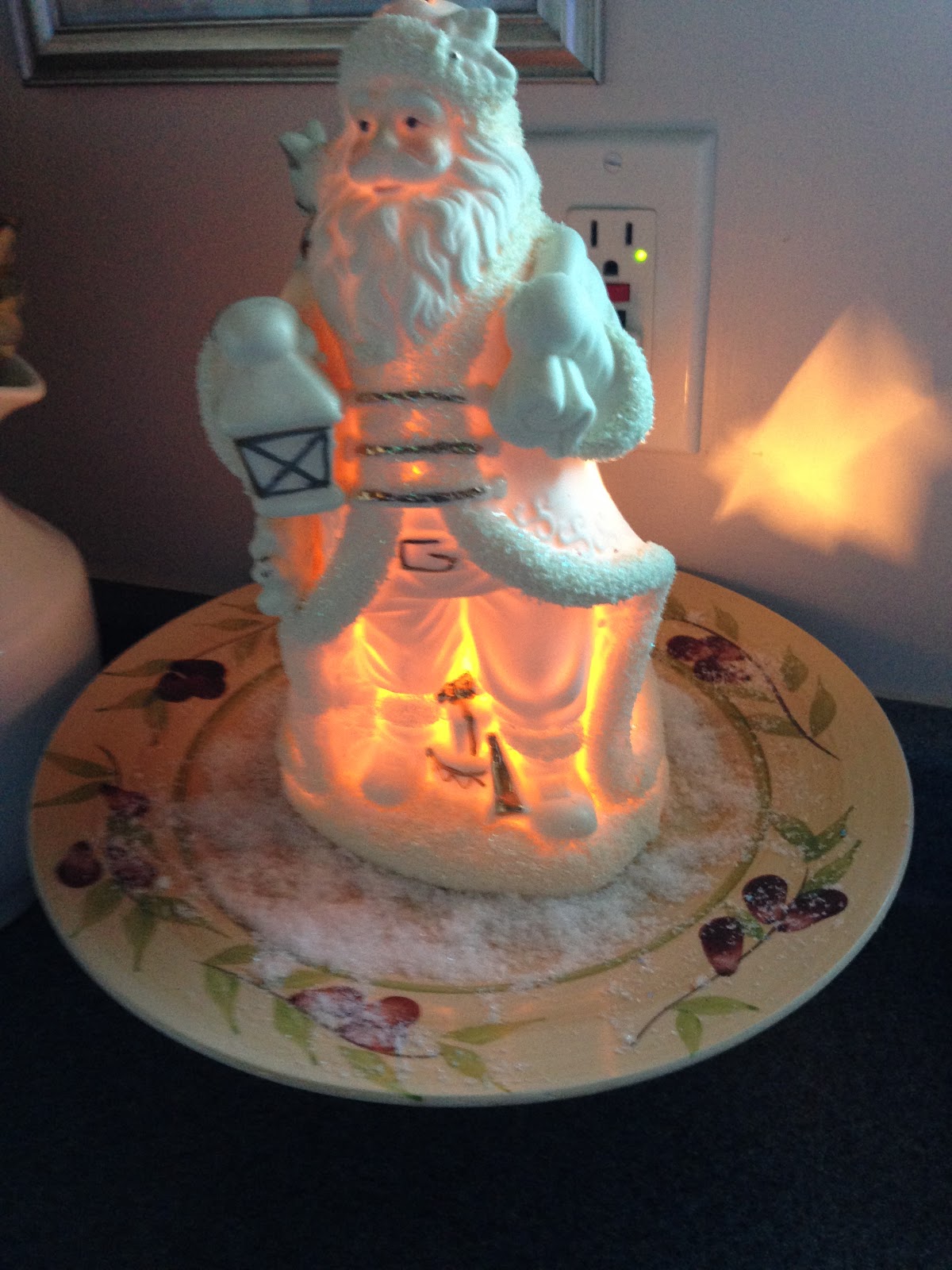 The kitchen is off the dining room & I set up a little vignette with this gorgeous Santa. How cute is this little snowman (girl) that I placed in a glass jar with snow?