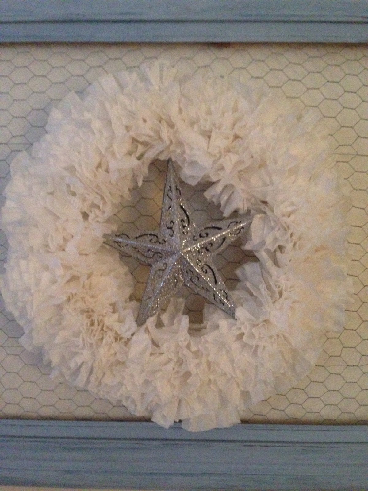 I keep this frame with chicken wire & coffee filter wreath up & just change out the center. At Thanksgiving I had a “gratitude” banner & for Christmas I added this silver star.