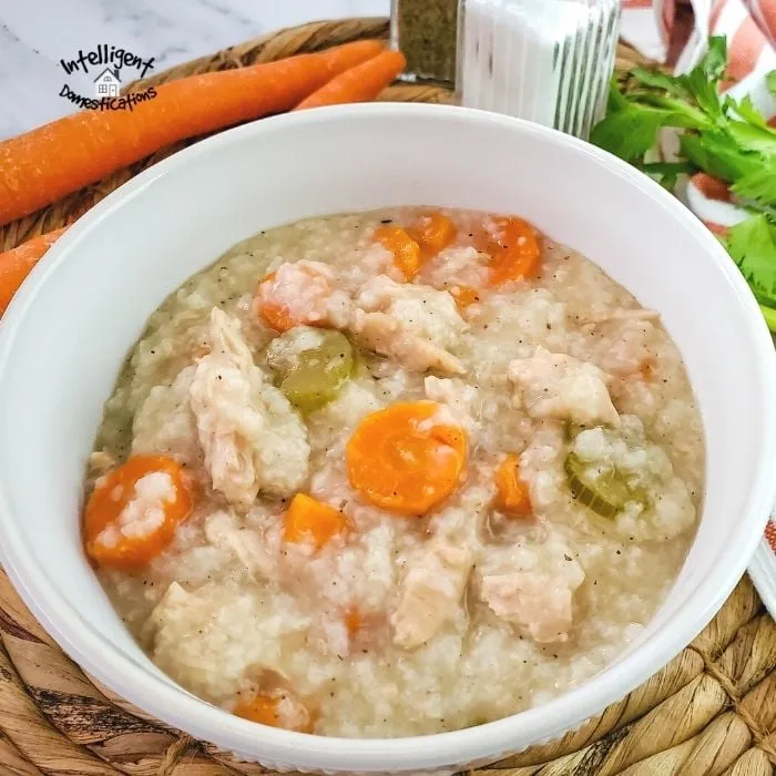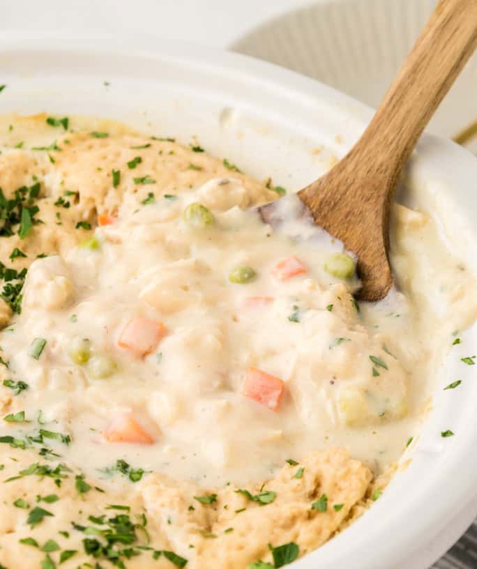Slow cooker chicken and Bisquick dumplings bring together juicy, shredded chicken in a savory broth with fluffy, pillowy dumplings on top.