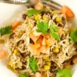 Slow cooker chicken and black beans with tender chicken simmering with black beans, corn, salsa verde, and spices. Serve it over rice or turn it into a tasty burrito bowl for an easy weeknight meal!