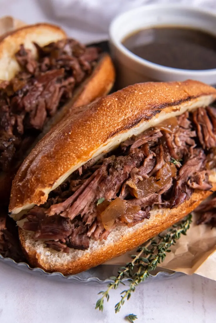 Slow cooker French Dip sandwiches are hearty, flavorful, and incredibly simple to make. Tender beef, gooey melted cheese, and a side of savory au jus make this warm, toasty sandwich a meal you’ll love.