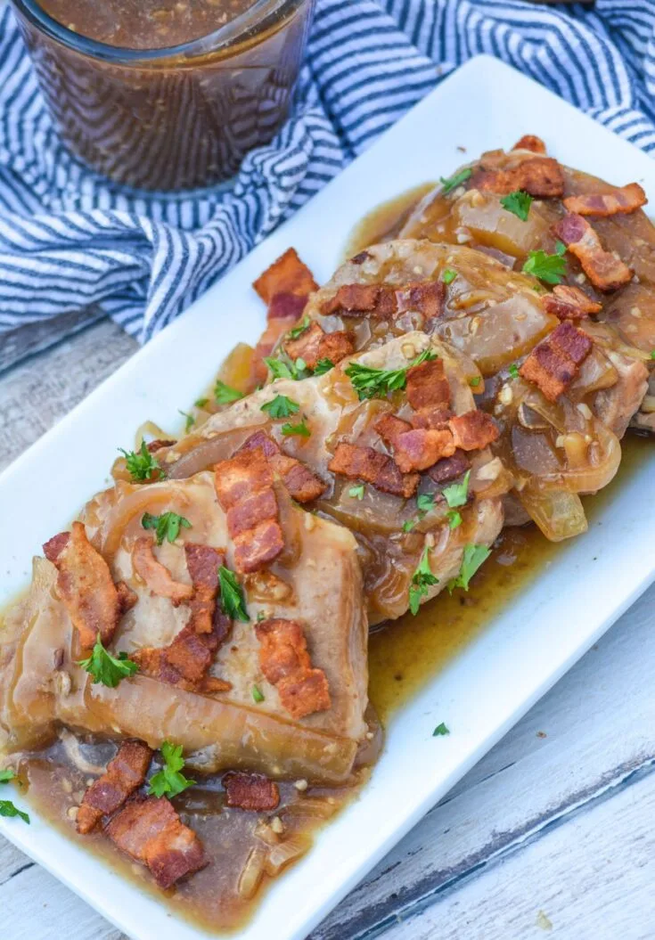 Tender boneless pork chops simmer slowly in a rich brown gravy, then are served over creamy mashed potatoes and topped with crispy bacon. These pork chops make the ultimate comforting meat-and-potatoes meal.