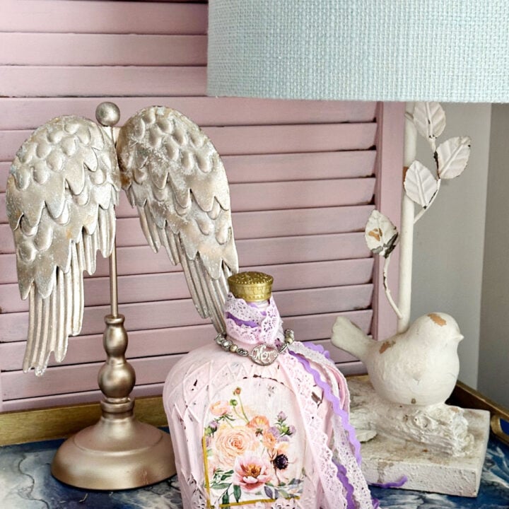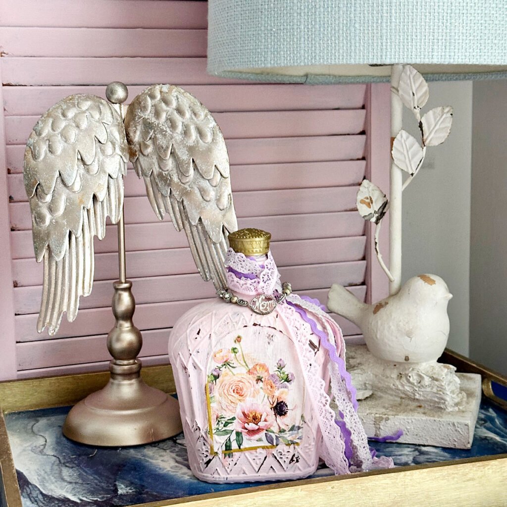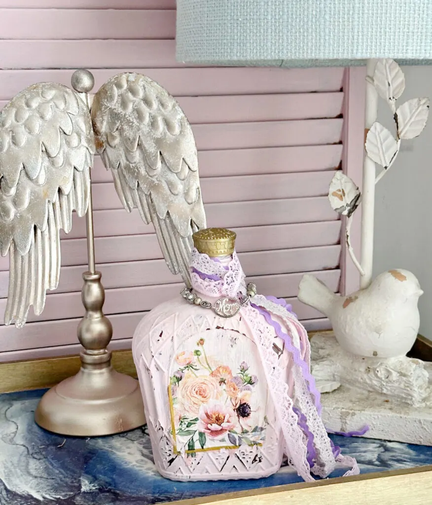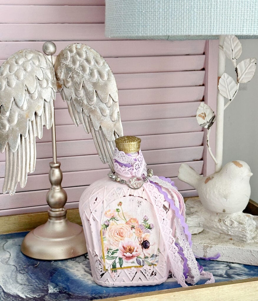Decorate your bottle as desired! To add extra dimension and customize the piece, I added a few delicate ribbon pieces and a cherished mom bracelet that my children gave me many years ago.