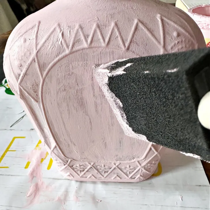 The next step is optional, but makes the details pop. Use your mini hand sander to distress the edges of the raised glass.