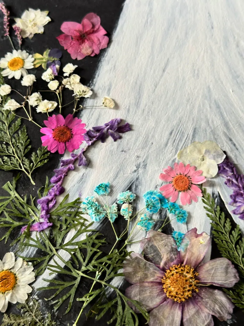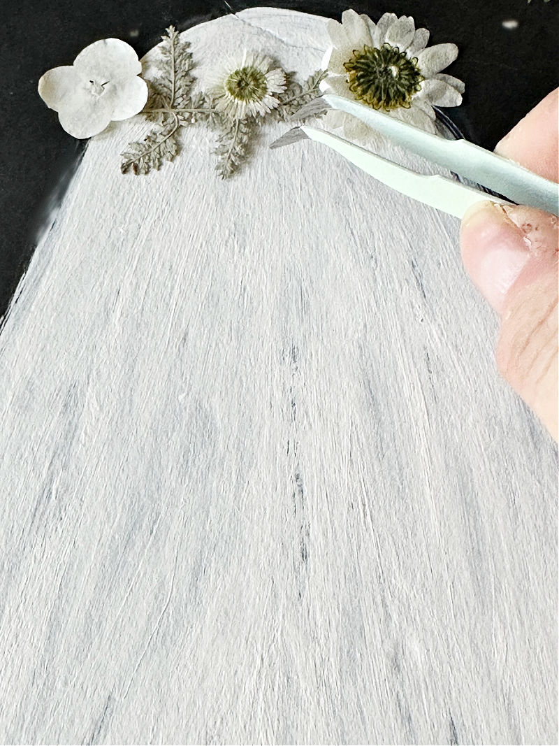 The next step is to add the pressed flowers to the ghost. The best way to do this is to place the flowers where you want them before securing them.