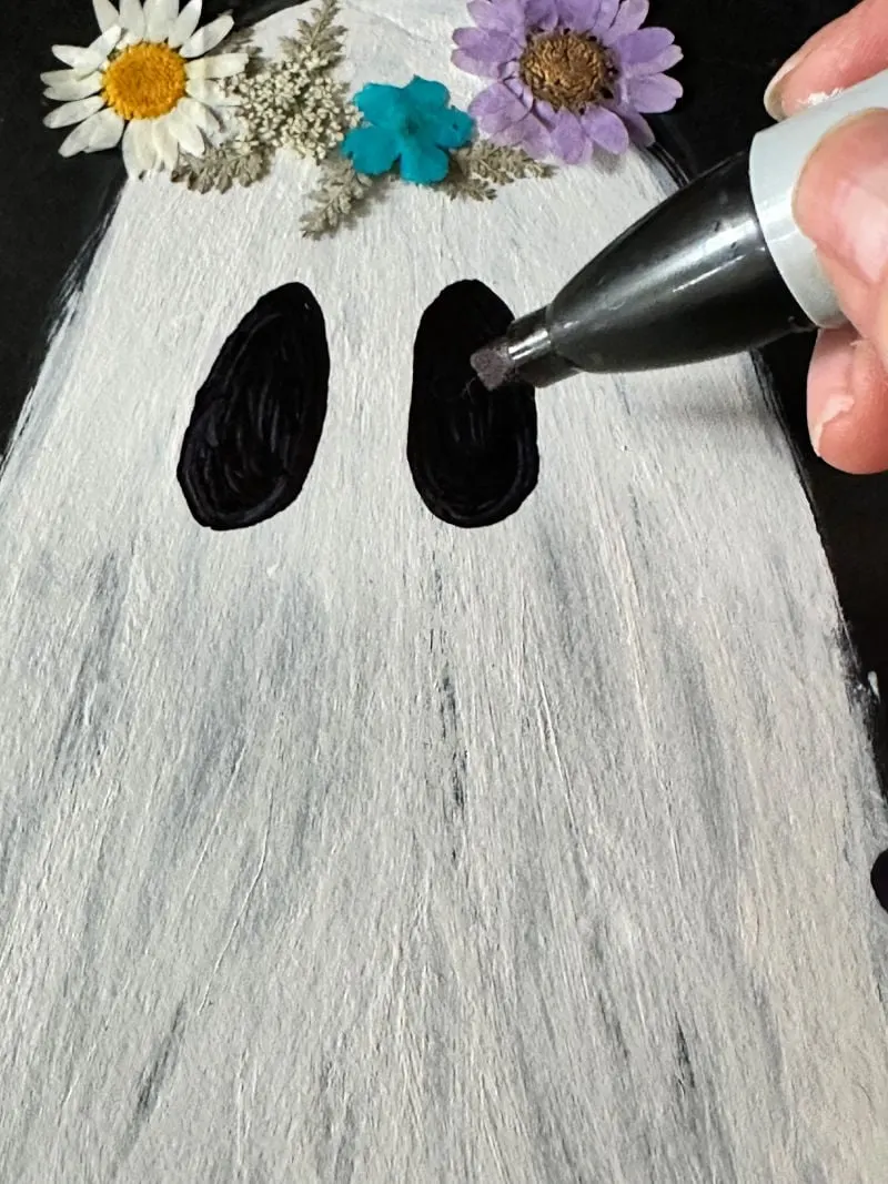 The final step is to draw the ghost face. I chose to add oval eyes and no mouth. A dot of white added to the bottom of the eyes gives it a bit of dimension.