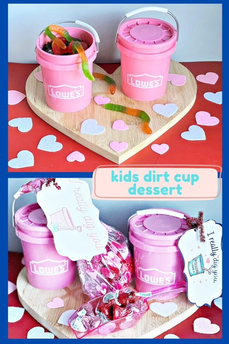 How to make a no bake dirt cup dessert in viral pink Lowe’s mini buckets with a free printable. A fun and easy Valentine’s Day dessert for kids and parties.