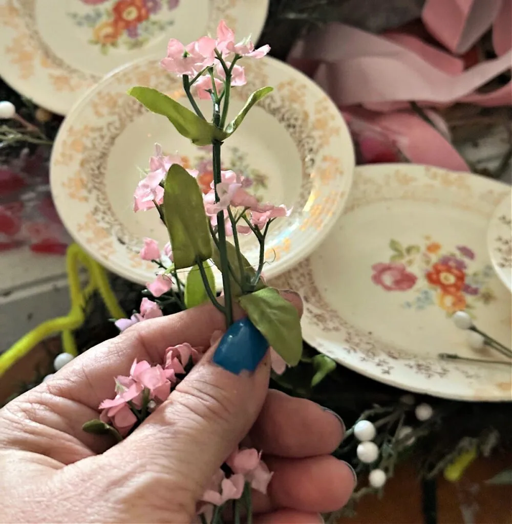 Now for the fun part, decorating! Add whatever greenery and florals you like. I’m loving the cottage core look and chose to go with pretty pink and white.