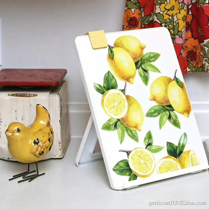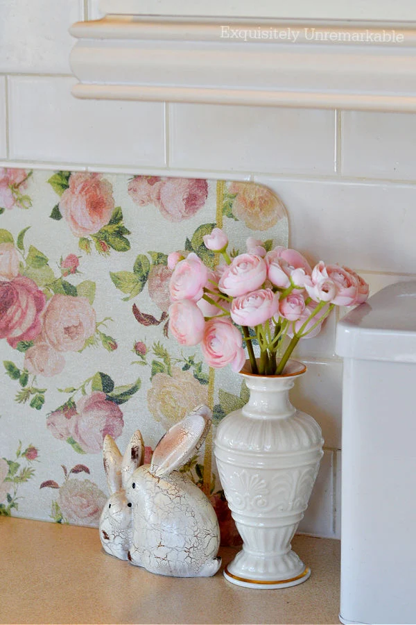 An old glass cutting board at the thrift store was just $1.99. It was pretty scratched up, but with a little decoupage magic, it became a charming and functional centerpiece with a cottage-style kitchen. You can find glass cutting boards at Dollar Tree too!