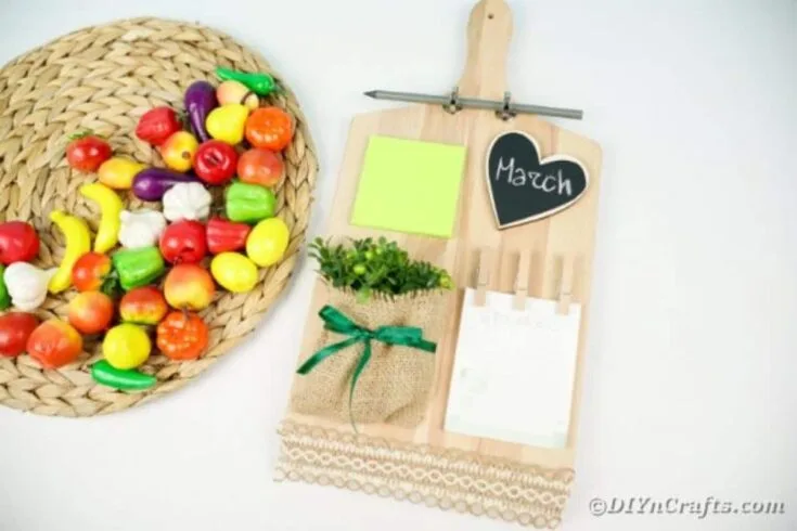 This charming upcycled wooden cutting board command center was inspired by similar creative projects. By combining a few favorite crafting supplies, you can turn an inexpensive board into a stylish and functional kitchen piece.