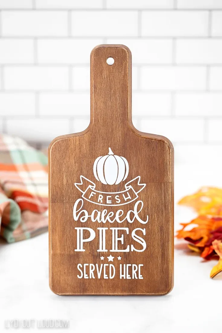 Make this adorable fresh baked pies sign using a cutting board and adhesive vinyl. Then flip it over to create a fresh baked gingerbread sign. Perfect for transitioning from fall to Christmas!