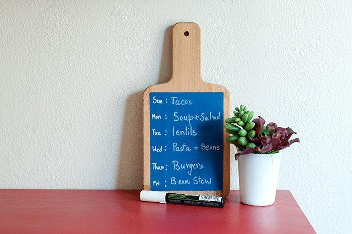 An old IKEA cutting board turned out to be the perfect solution for a weekly meal planner in the kitchen where it's always visible. You can also use a Dollar Tree cutting board to create your own easy and affordable menu board!