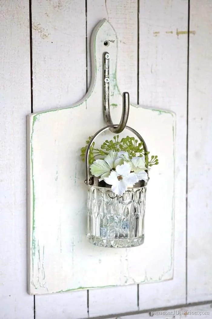 The hanging glass wall vase turned out just lovely. The combination of the wooden board and the silver-rimmed cut glass jar with its little handle was truly a perfect match.