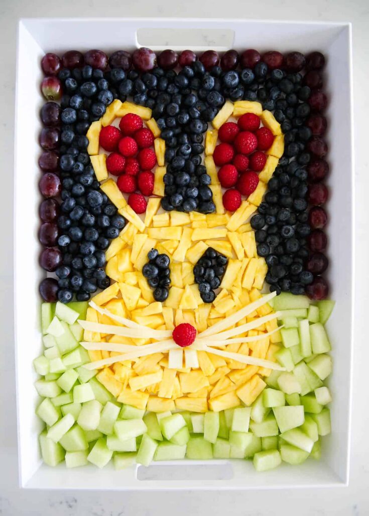 This vibrant fruit platter is the perfect festive starter for any Easter celebration or springtime brunch! Arranged in an adorable bunny shape, it features a colorful mix of fresh fruits and succulent berries. Kids are sure to get a kick out of this treat!