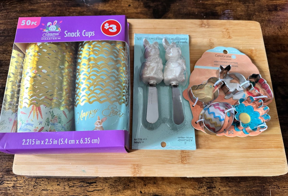 The adorable bunny spreaders and mini cookie cutters are from Michaels. They were 40% off! I scooped up the festive snack cups at Dollar Tree.