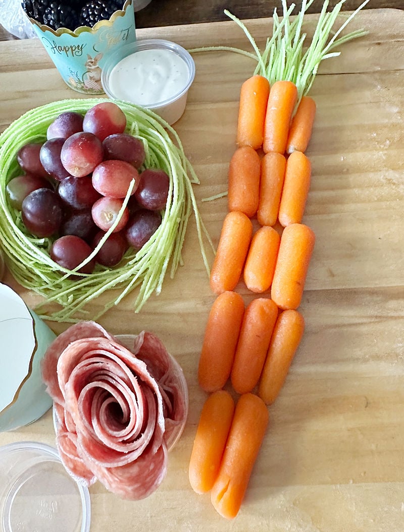 That’s all there is to it! A colorful meat, cheese and fruit board perfect for Easter.