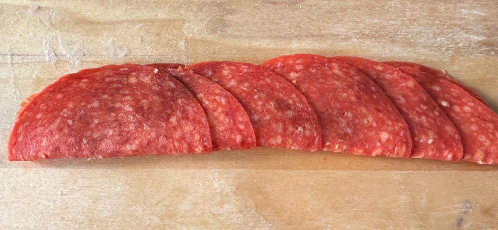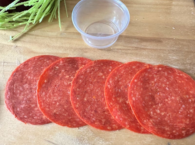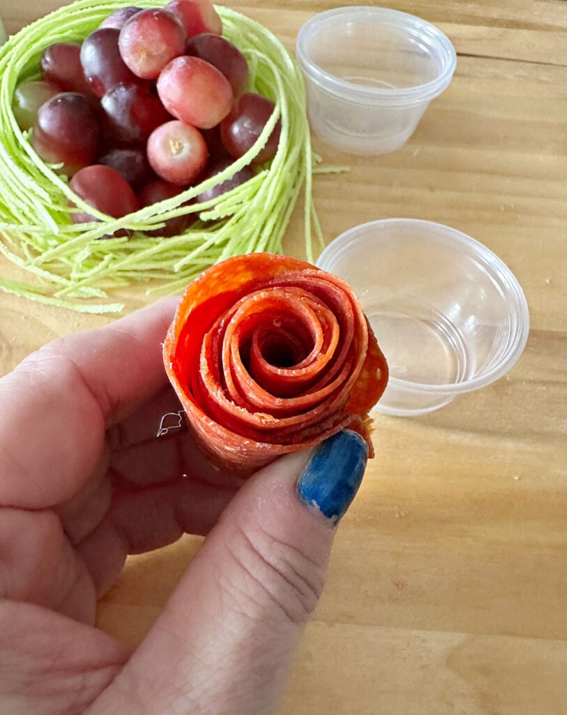 I love the look of pepperoni roses on a charcuterie board. The easiest way to make them is to layer 5-6 thin slices of pepperoni or salami.