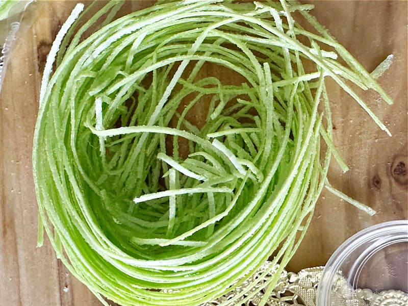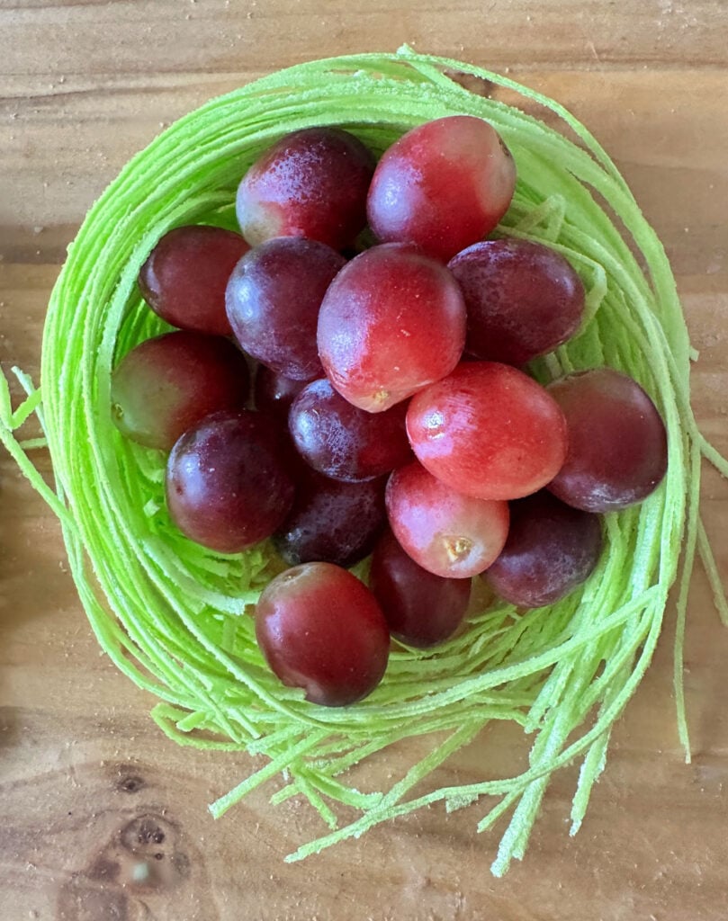 Create a nest with edible grass to make a focal point and display red grapes. This brings in more texture and dimension.