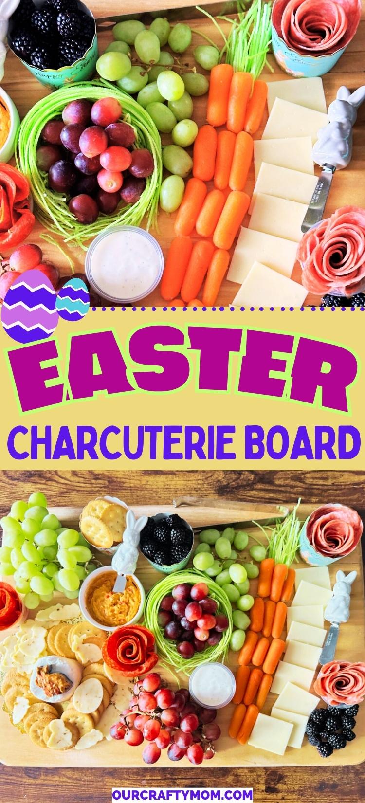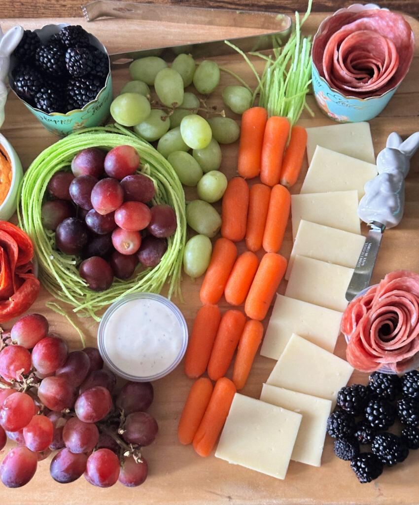 For this Easter charcuterie board, I kept it simple with a colorful mix of fresh fruits, crunchy veggies, tasty crackers, savory meats, and creamy cheeses for a classic meat and cheese tray.