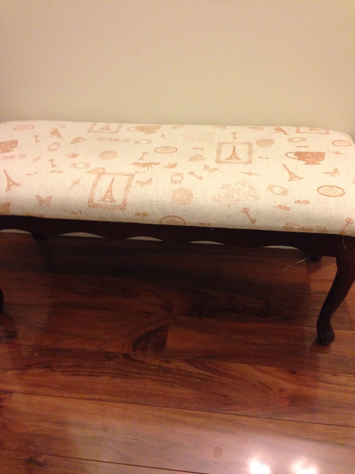 Welcome to Our Crafty Mom! I have always loved flokati rugs and have been wanting to recover an old bench I have had forever in this faux fur. I picked some up beautiful faux fur at Joann Fabrics for 60% off. What a steal! This bench started out in a tapestry fabric about 25 years ago. It has beautiful legs and is a very solid piece. I just needed to tighten up the legs a little bit. I originally gave it an update last year when I recovered it in a muslin fabric that I stamped french images on. I liked it, but I got bored with it and knew this was perfect bench for my new faux fur fabric.