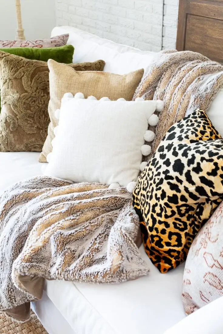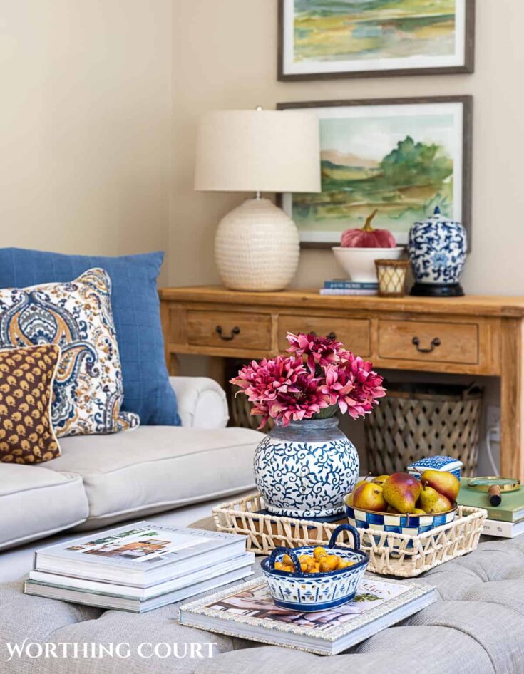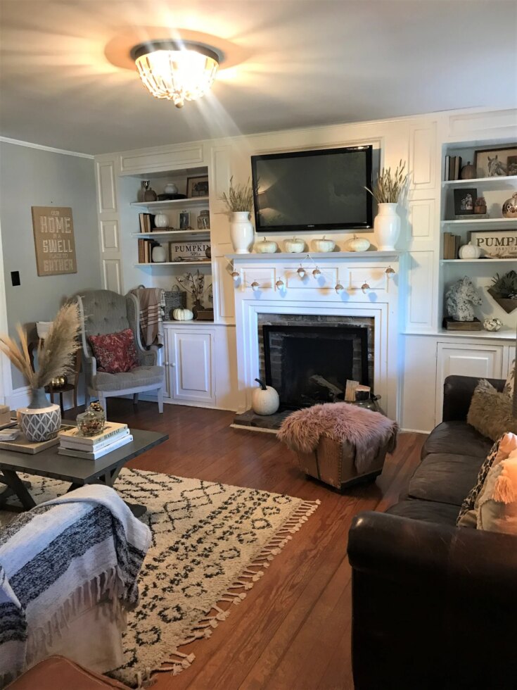This space features an overall neutral palette accented with soft pastels and touches of gold. The addition of fall decor adds that cozy, inviting feel that makes any living space feel warm and welcoming.