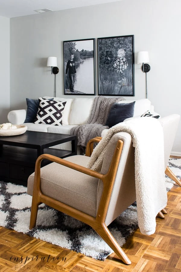 A once-cluttered basement is refreshed and transformed. Check out the reveal of this lovely revamped living room in classic black and white.